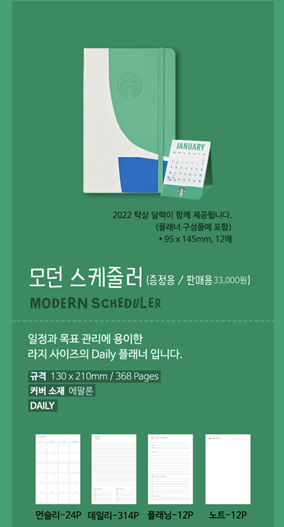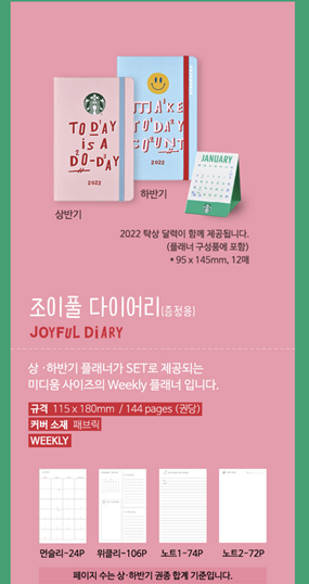 위에서부터 순서대로 먼슬리 24P, 데일리 314P, 플래닝 12P, 노트 12P
