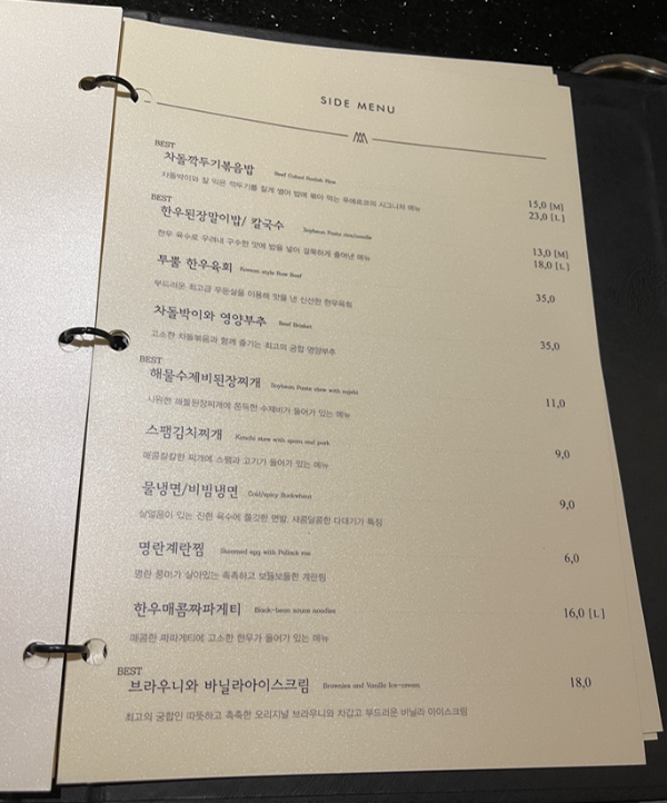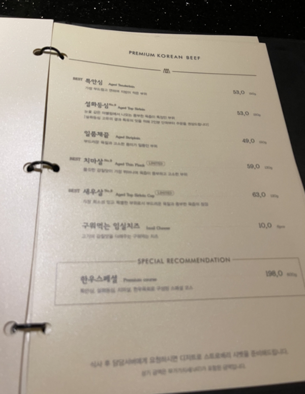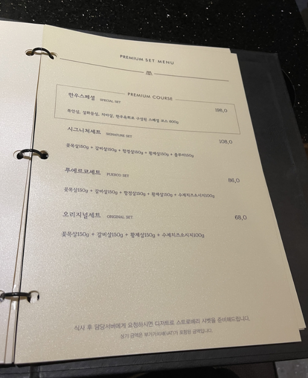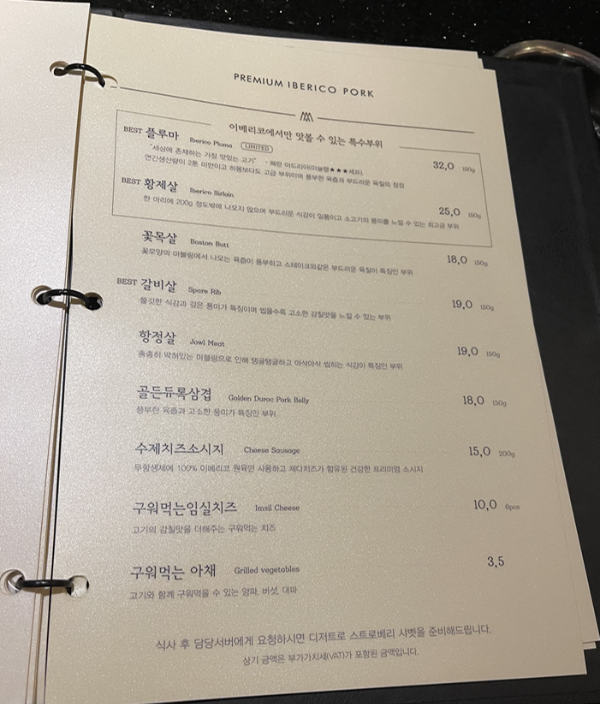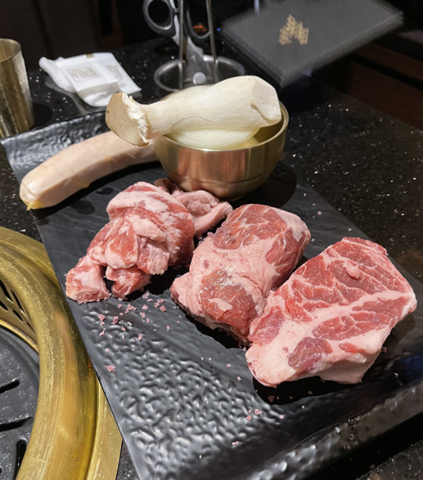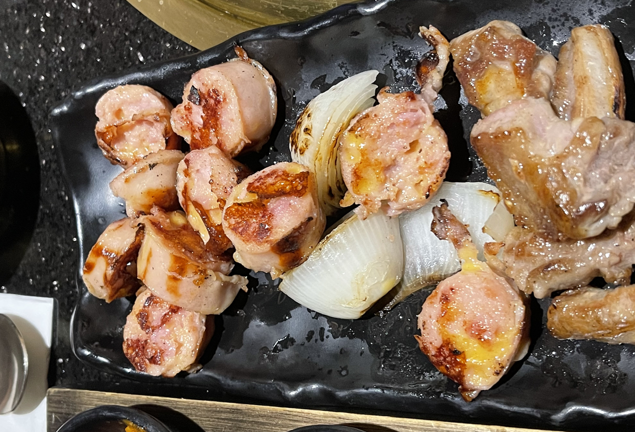 그리고 서버분께서 고기구우면서 첫번째 판에 나온소세지를 같이 구워주셨다. 이제 얘네 더이상 안먹을 것 같았나보다. 소세지는 겉으로봣을때 심심해보였는데 굽고나서보니 치즈가 그득그득한 치즈소세지였다. 소세지도 고급진 맛이었다. 사실 사이드메뉴도 먹어보고싶었고 디저트도 먹고싶었는데 고기하나를 추가했더니 배가불러서 다른것은 맛 볼 수가 없었다. 사실 베스트로 추천하는 플루마나 황제살은 가격대가 좀있어서 맛이 검증이 된 다음에 먹어보고 싶어서 기본만 시켜봤는데 아주 검증이 되어서 다음번 방문때는 저 두메뉴를 주력으로 먹어볼 참이다.