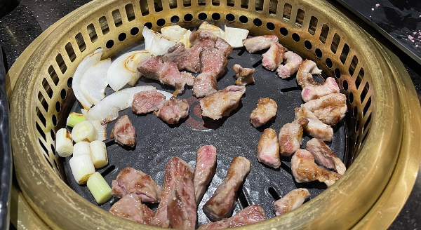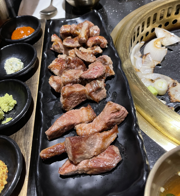 이렇게 야채랑 고기세종류를 한꺼번에 구워서 접시에 올려준다. 구우면서 먹는 시스템은 아닌것 같았다. 딱 굽자마자 한점을 먹었을때 진짜 너무맛있어서 갈비살은 무조건 하나를 더 먹어야겠다고 생각했다. 근데 다음것도 그다음것도 너무 맛있어서 조그맣게 잘라서 천천히 음미하면서 먹었다.