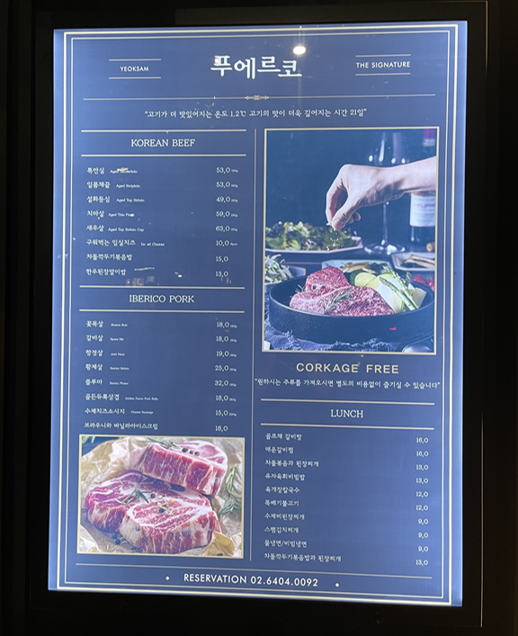 며칠전 역삼에 일이 있어 갔다가 지인을 만나기로 해서 무얼 먹을지 고민하다가 고기를 먹으러 가기로 했다. 요즘 한창 저탄고지에 입문한 나로서는 맘에 드는 식당 찾기가 좀 곤란했는데 이베리코 전문점이 있다는 소리에 얼마나 반가웠는지 모른다. 푸에르코는 역삼역에서 정말 나오자마자 3번 출구 앞에 있는 식당으로 지하철을 이용하는 사람에겐 너무나도 편리한 위치에 있다. 오픈은 11:30 이고 14:30~17:00 까지 브레이크 타임이 있어서 잘 체크하고 가야겠다.
