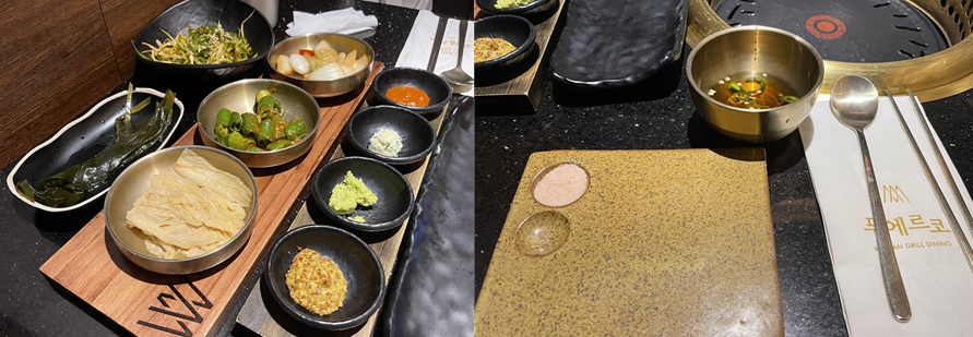 처음 들어가는 입구에서의 느낌은 고급진 레스토랑의 느낌이 물씬 났다. 그리고 다른 고깃집들과는 다르게 고기굽는 냄새랄지 쩐내같은게 안나서 신기했다. 딱 깔끔하고 고급진 레스토랑의 느낌만 났다. 그리고 나도 모르게 티쪼가리에 레깅스를 입고간 스스로가 약간 위축이 될 정도로 너무 깨끗하고 예쁜 분위기 였다.